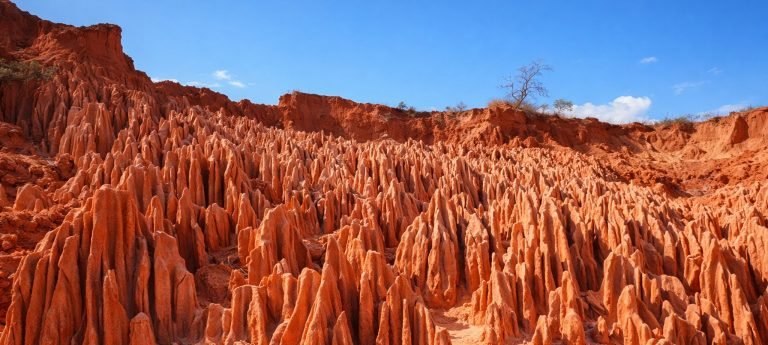 One of the most distinctive sights in the far north is the Red Tsingy, also known as the Tsingy Rouge, located south of Diego Suarez. Unlike the grey limestone formations found elsewhere in Madagascar, these sculpted pinnacles are made of red laterite soil, carved by wind and rain into sharp, fragile shapes. The site is compact but visually striking, and its intense color makes it unlike any other tsingy landscape on the island. A visit here offers insight into Madagascar’s geological variety and complements the harsher coastal scenery around Antsiranana.